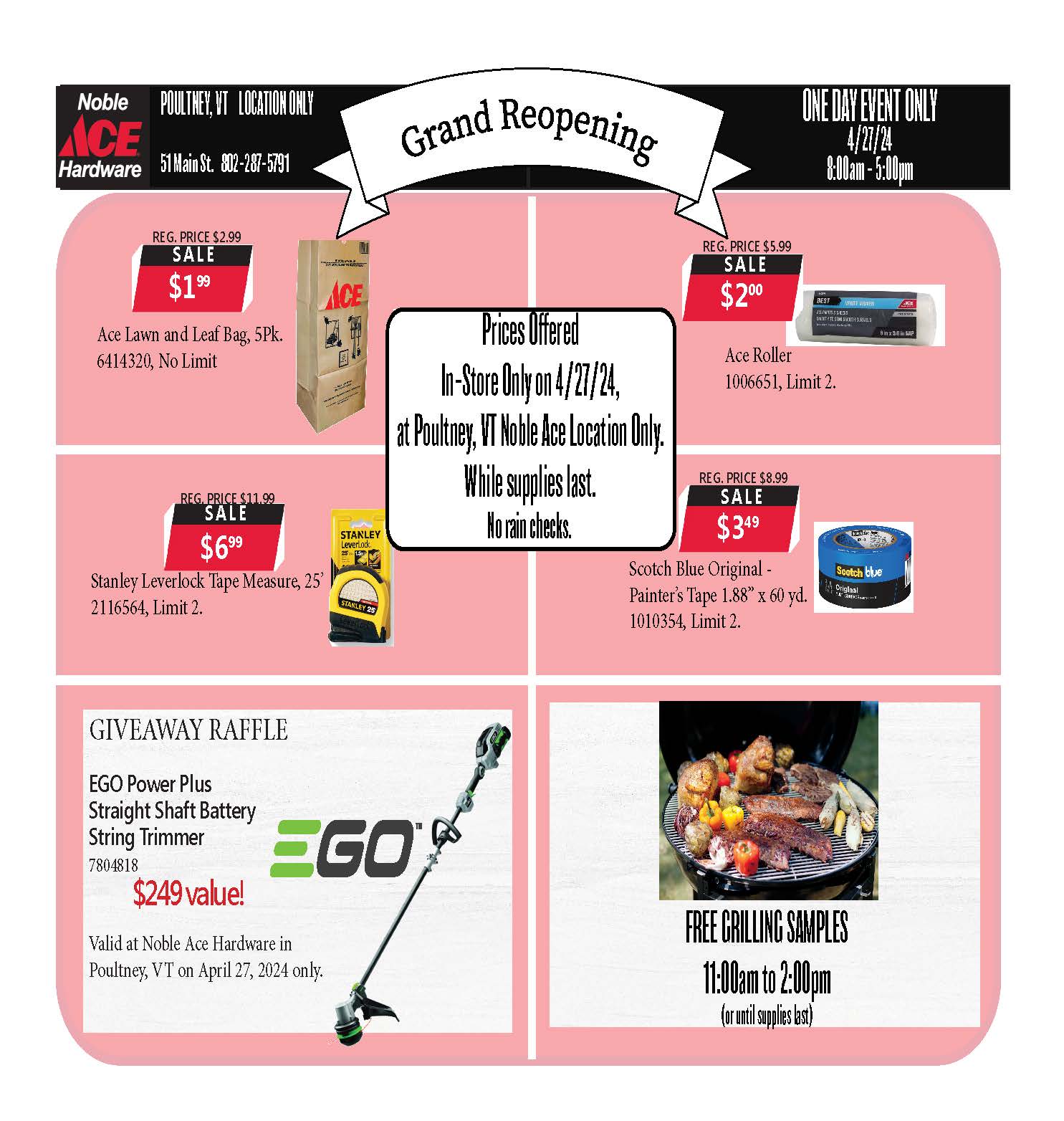 « All Events This event has passed. Ace Launch Party grilling – Rutland, VT April 27, 2024 @ 11:00 am - 2:00 pm « Ace Launch Party grilling – Poultney, VT Ace Launch Party grilling – Cambridge, NY » + Google Calendar+ iCal Export Details Date: April 27, 2024 Time: 11:00 am - 2:00 pm